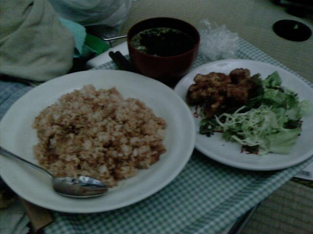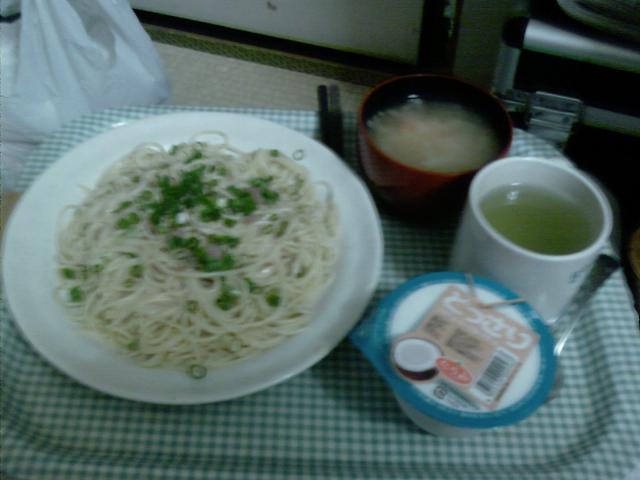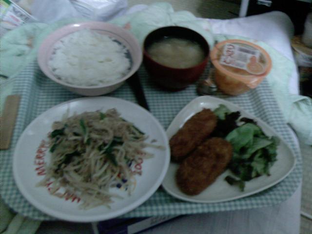 お品書き ご飯 白菜の味噌汁 みかんゼリー もやし炒め クリームコロッケ、レタス みかんゼリーは無理やり食った。