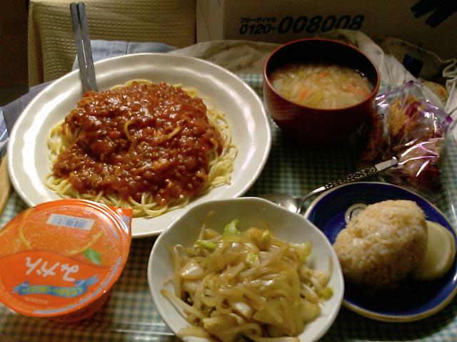 食欲がなくて、野菜炒めとおにぎり、たくあんは残しちゃった。。